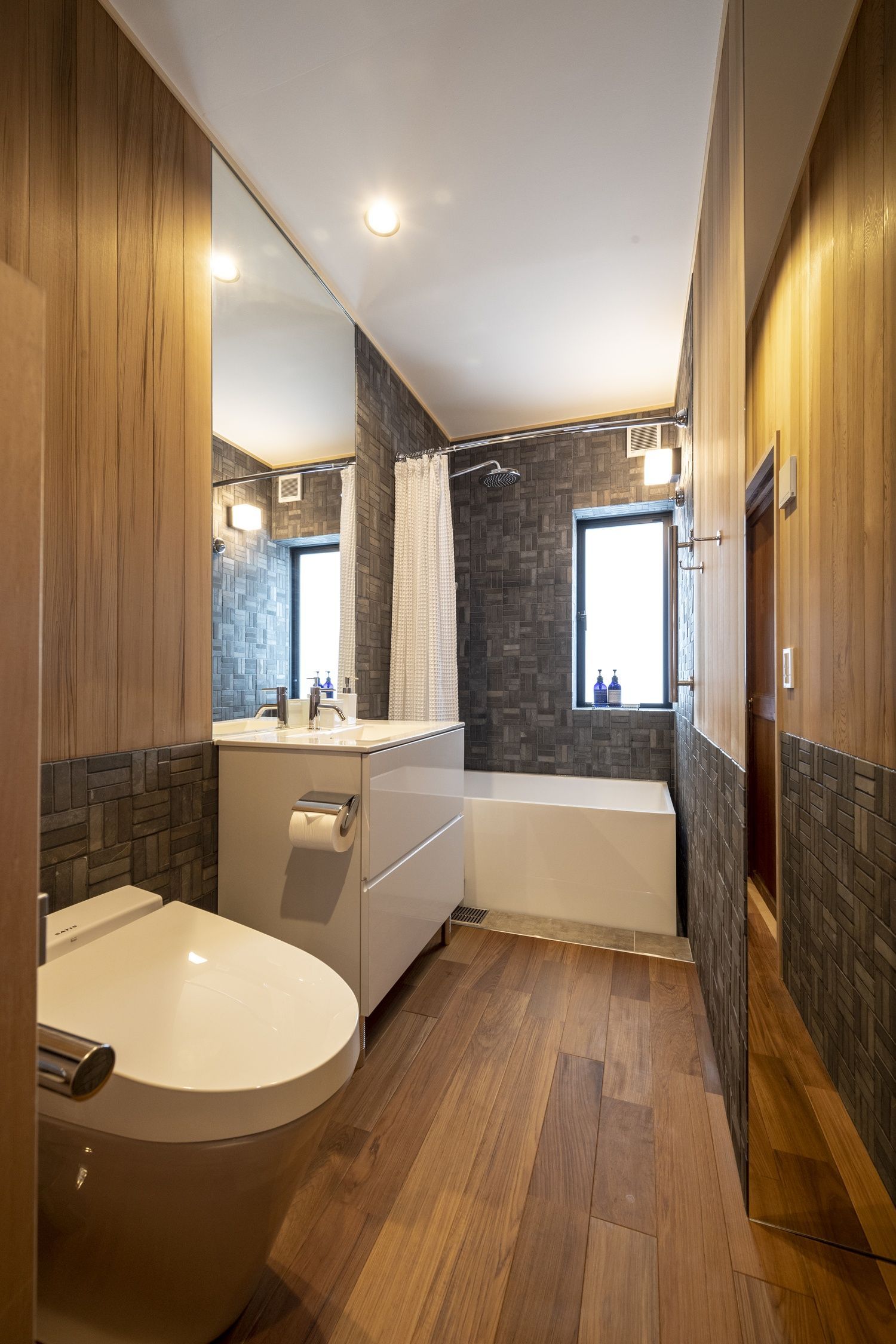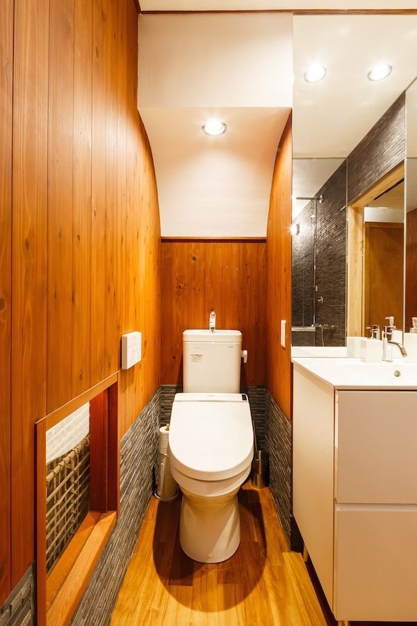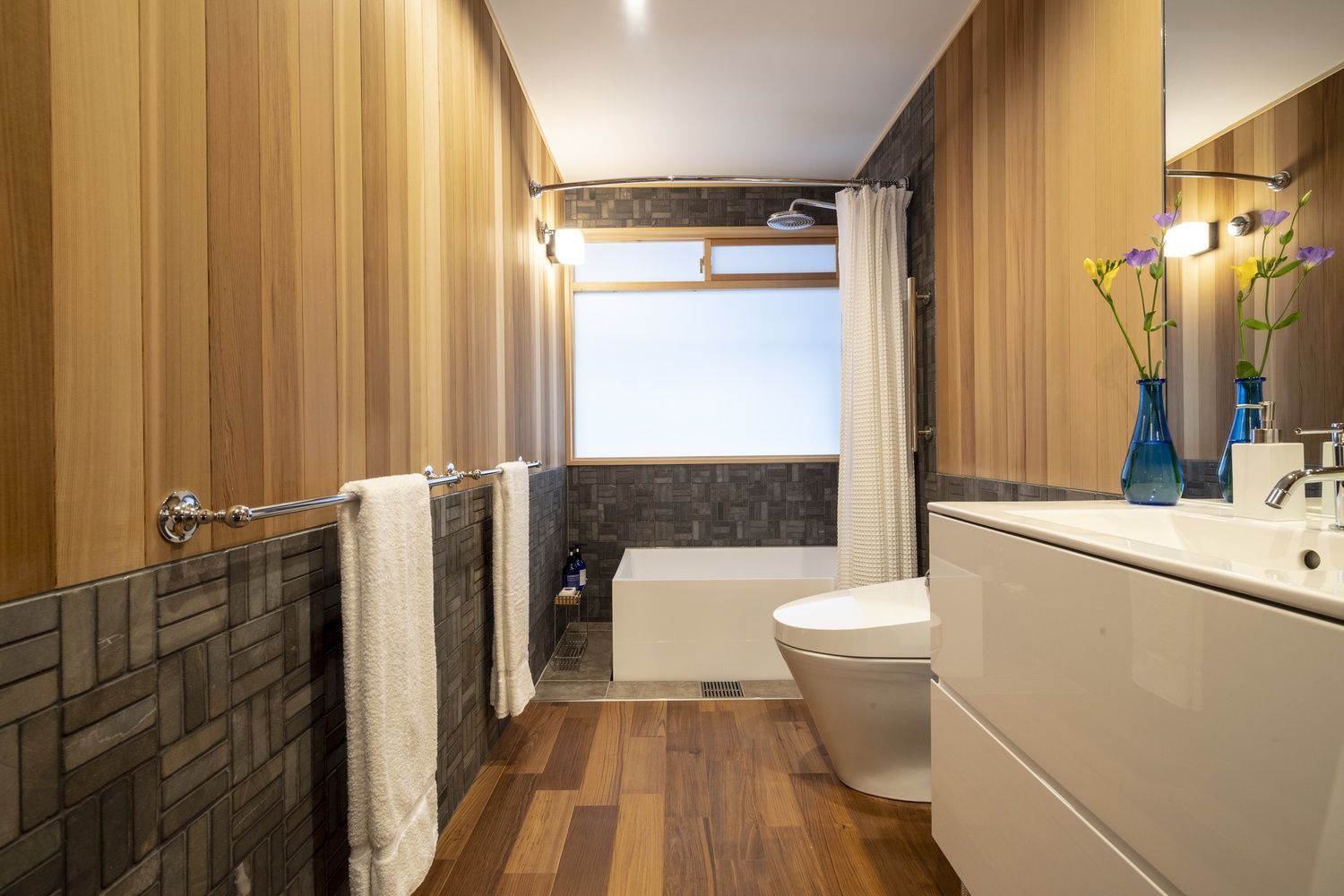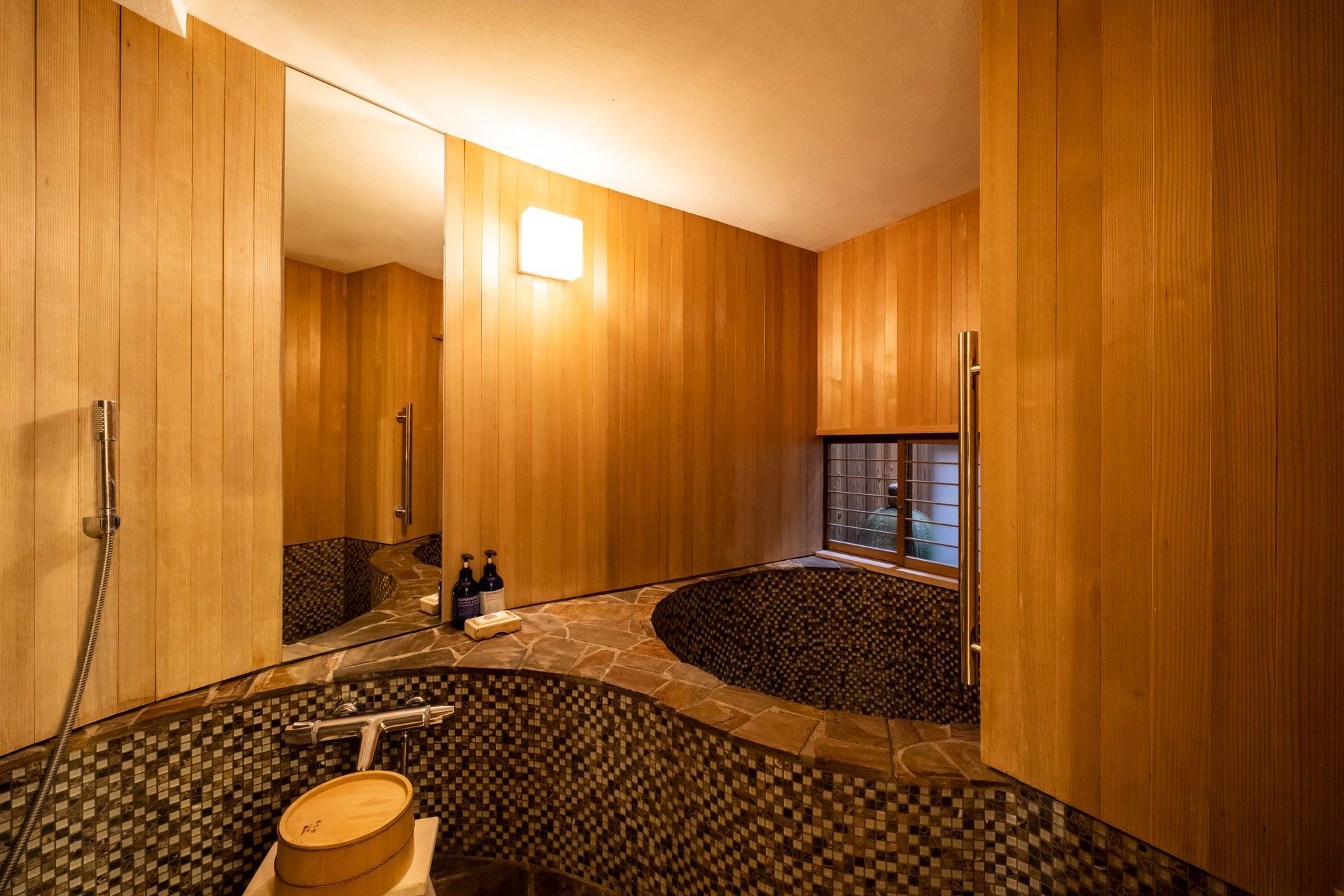 The Lower Level ambiance is captivating yet cozy, exuding a modern Japanese aesthetic. Original Japanese architectural details are complimented by antique lighting fixtures and woodwork throughout, and by a thoughtful curation of antique Japanese and Scandinavian furniture, mixed with modern hand-crafted furniture by Japanese artisans. Beautiful handcrafted “washi” (Japanese paper) is used on ceilings and sliding doors. The exceptional design feature of this unit is the high-end, custom-built bath and shower area, which is made of stone. The oversized bath tub large enough for three persons. There is a private “tsuboniwa” inner garden, which can be viewed from the living room or the bath tub. The kitchen is fully stocked with everything one could need to prepare simple meals.