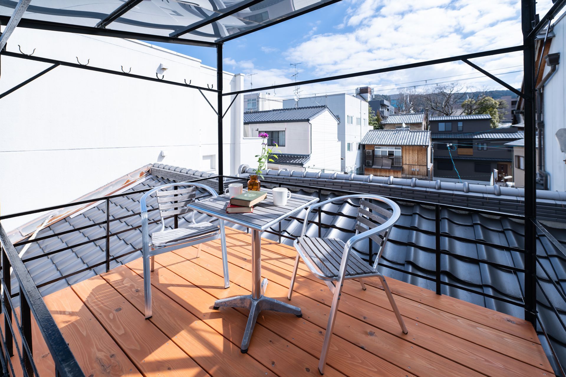 Modern comfort features include radiant heating under the wooden floors, a large Western style bathtub, and wireless high-speed Internet. The high-tech toilet has all the bells and whistles. The kitchen is entirely new and fully equipped. There is a washer/dryer. This spacious unit has a tatami mat bedroom with double futon, and a Western-style bedroom with a comfortable double bed. In the living room, there is a 42 inch flat-screen cable TV, with access to many international channels. There is a wooden roof deck with chairs and table, a perfect place to sip your morning coffee while enjoying the views of surrounding hills, as well as a view of the maple trees of neighboring Kenninji temple, which is the oldest Zen temple in Japan.