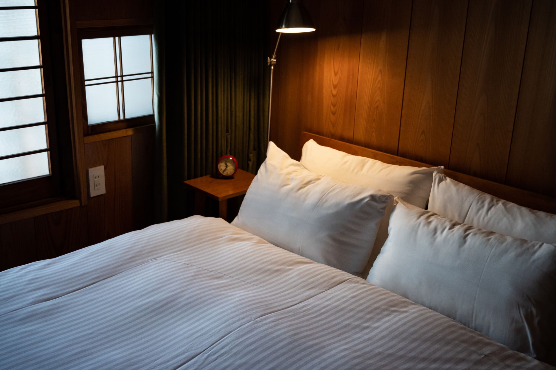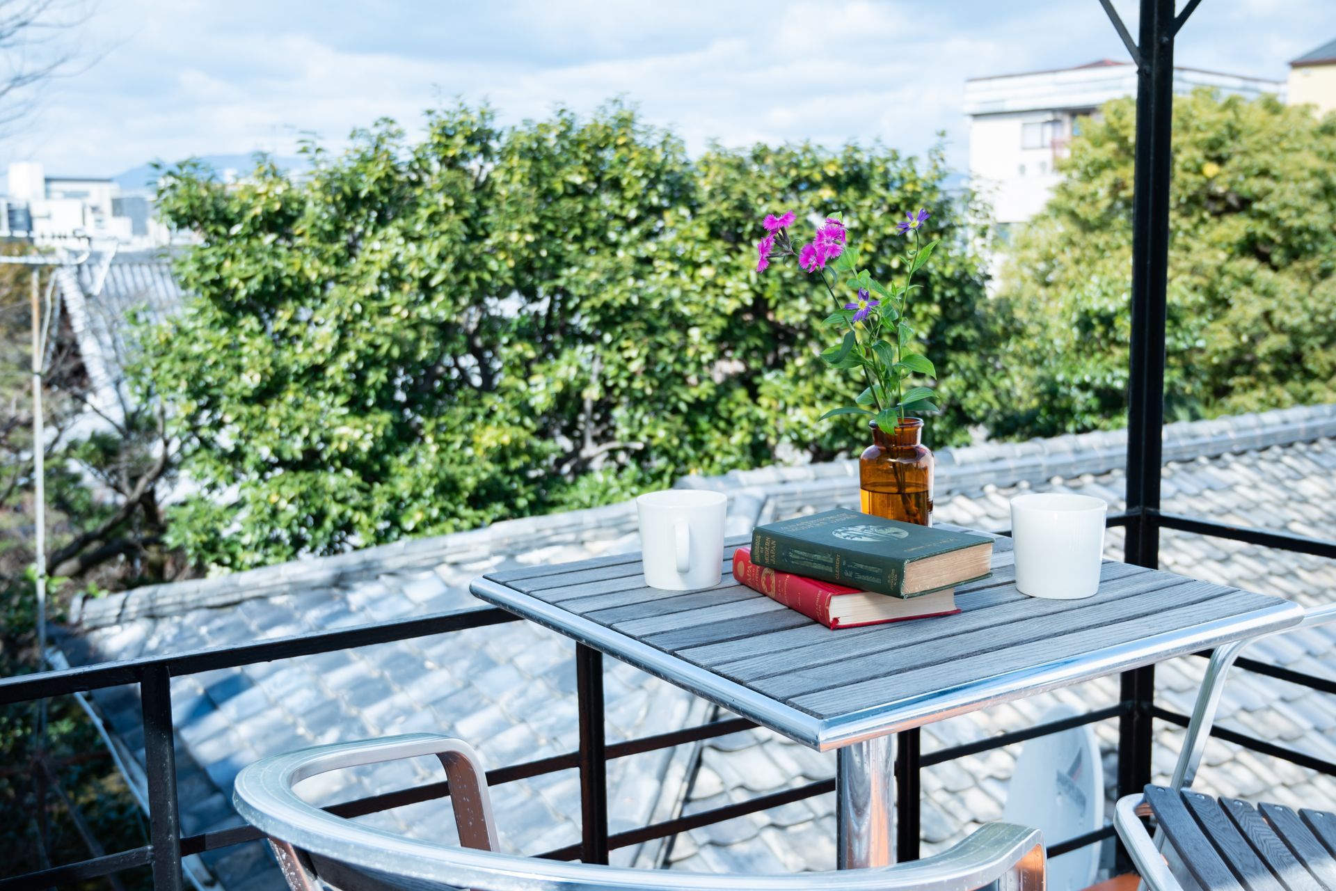 Indigo House Gion Upper Level is particularly airy and it is flooded with natural light. Similar to the lower level, the two bedrooms retain many of the original architectural details. The master bedroom has a high quality extra-wide double bed, while the second bedroom has a multiple layer double futon. The rear bedroom has windows facing south, with an expansive view of the area of Kenninji Temple where you can see the monk’s cemetery and vegetable gardens, as well as the buildings where the monks live. There’s a lot of blue sky and green trees, and natural light. You can hear the sound of monks chanting their prayers early in the morning.