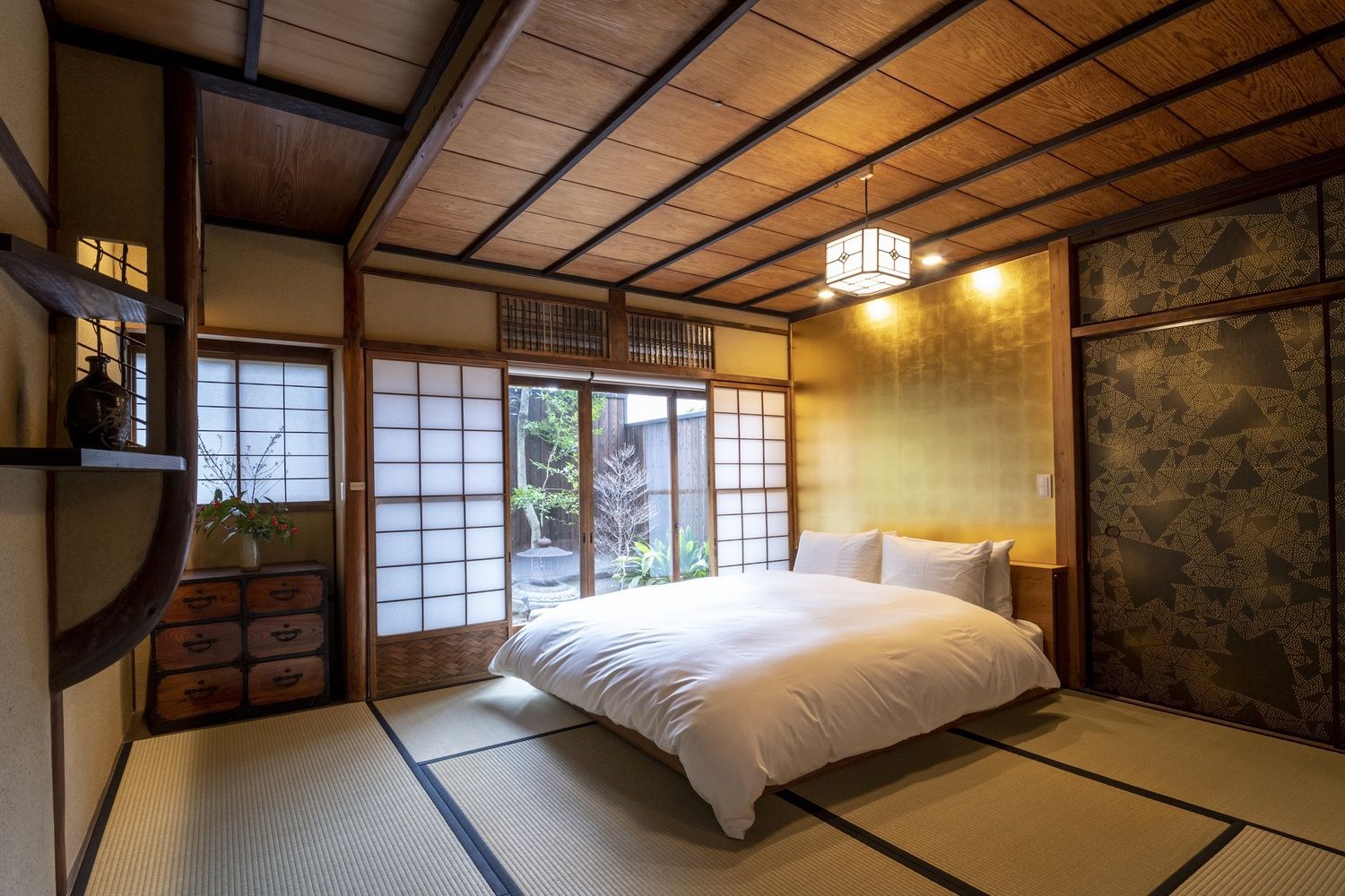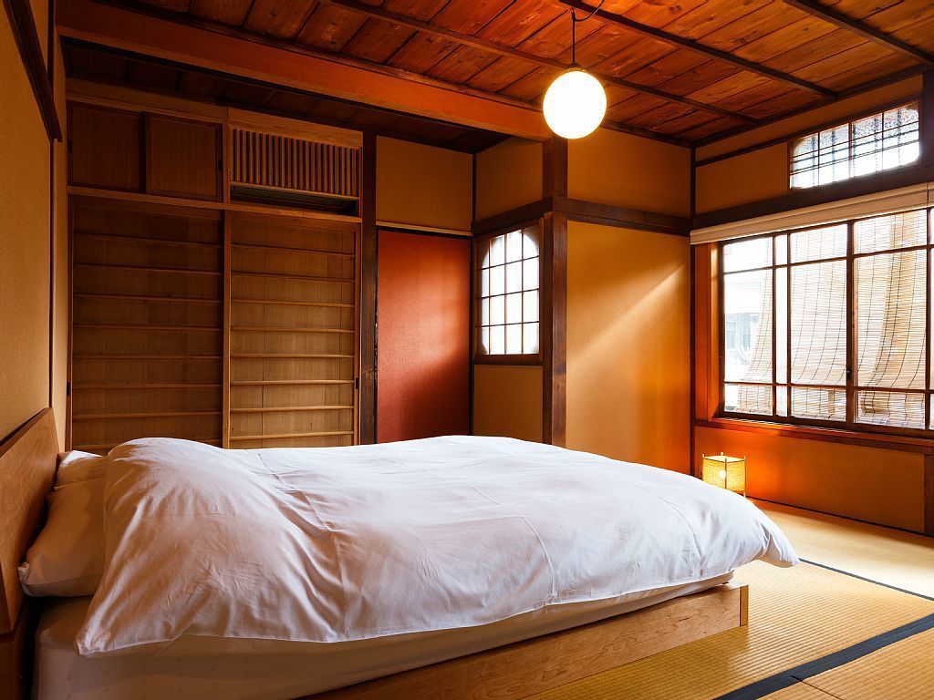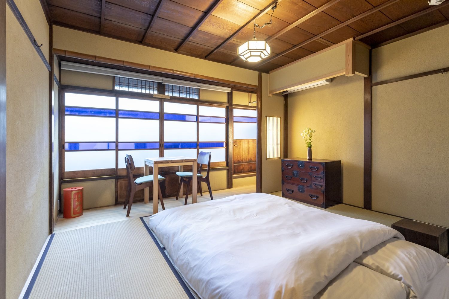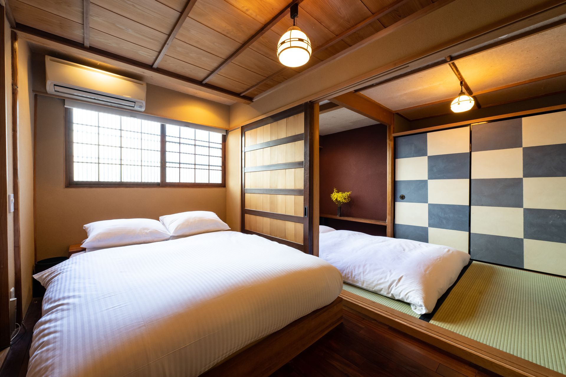 The Gion House Upper Level encompasses the entire upper floor of The Gion House, a traditional machiya which is steeped in history. Nestled on a quiet side street in the heart of Gion, the house was meticulously renovated in early 2023. With its own entrance, the Upper Level is completely independent from the Gion House Lower Level. There is room for up to four to sleep... two in the tatami bedroom on a futon, and two in the double bed in the Western-style bedroom. Alternatively, the entire house can be rented for up to eight persons.