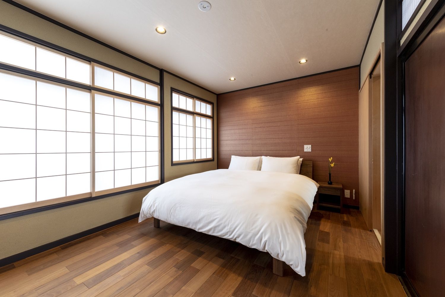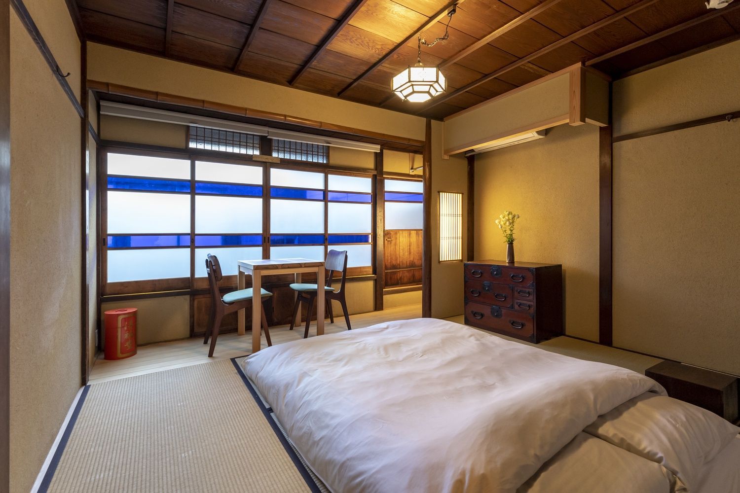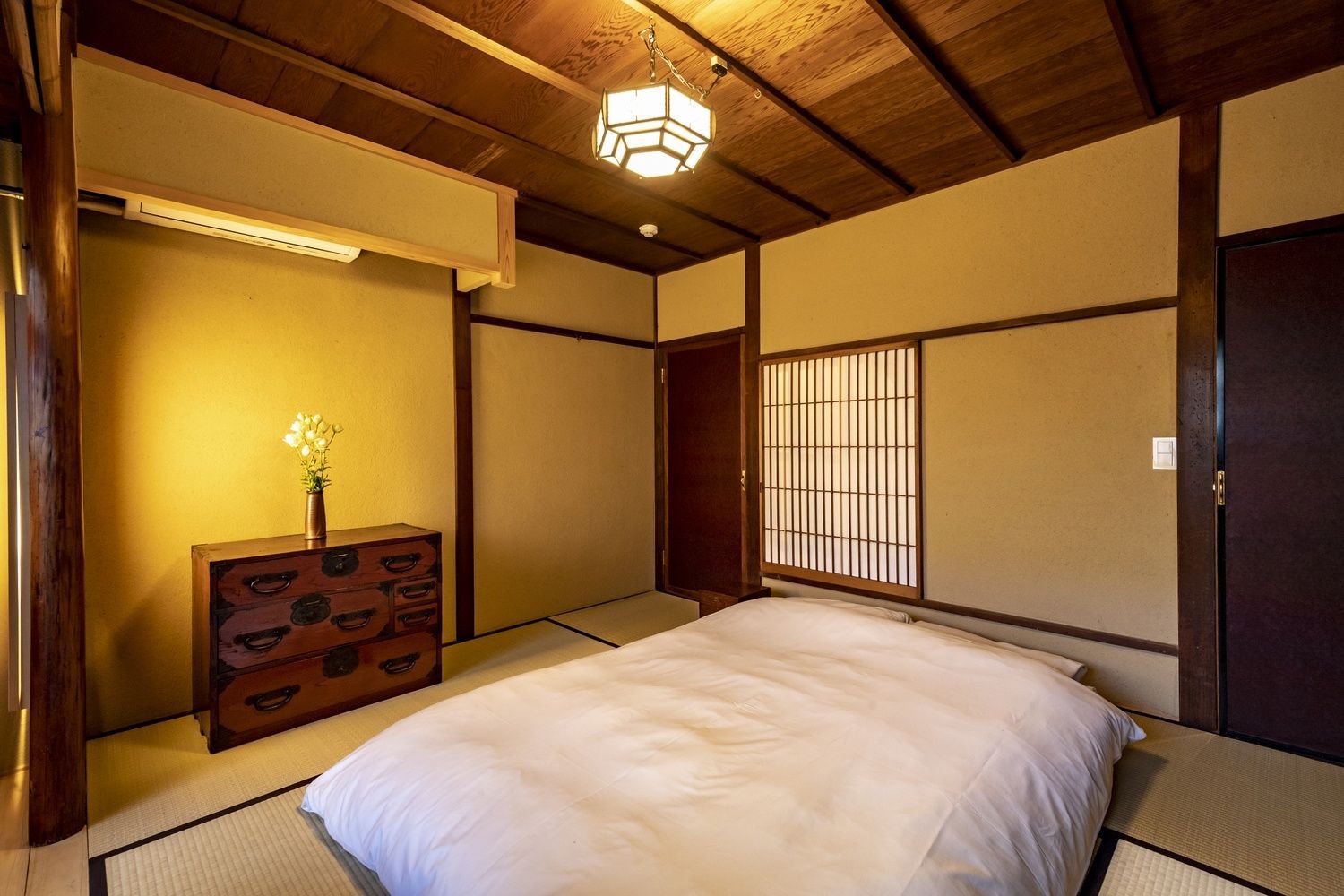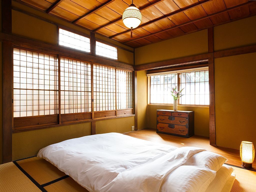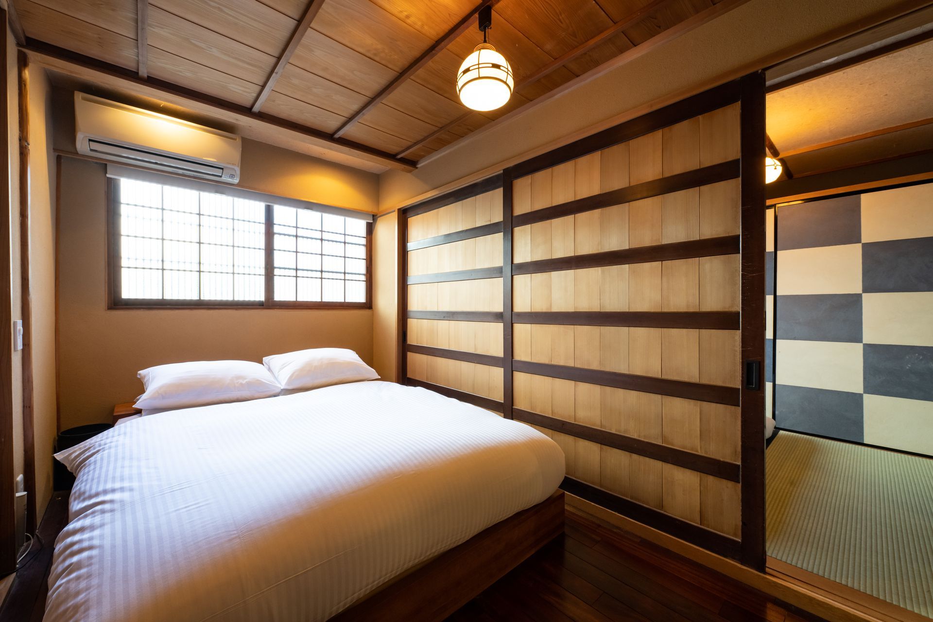 The Gion House Upper Level encompasses the entire upper floor of The Gion House, a traditional machiya which is steeped in history. Nestled on a quiet side street in the heart of Gion, the house was meticulously renovated in early 2023. With its own entrance, the Upper Level is completely independent from the Gion House Lower Level. There is room for up to four to sleep... two in the tatami bedroom on a futon, and two in the double bed in the Western-style bedroom. Alternatively, the entire house can be rented for up to eight persons.