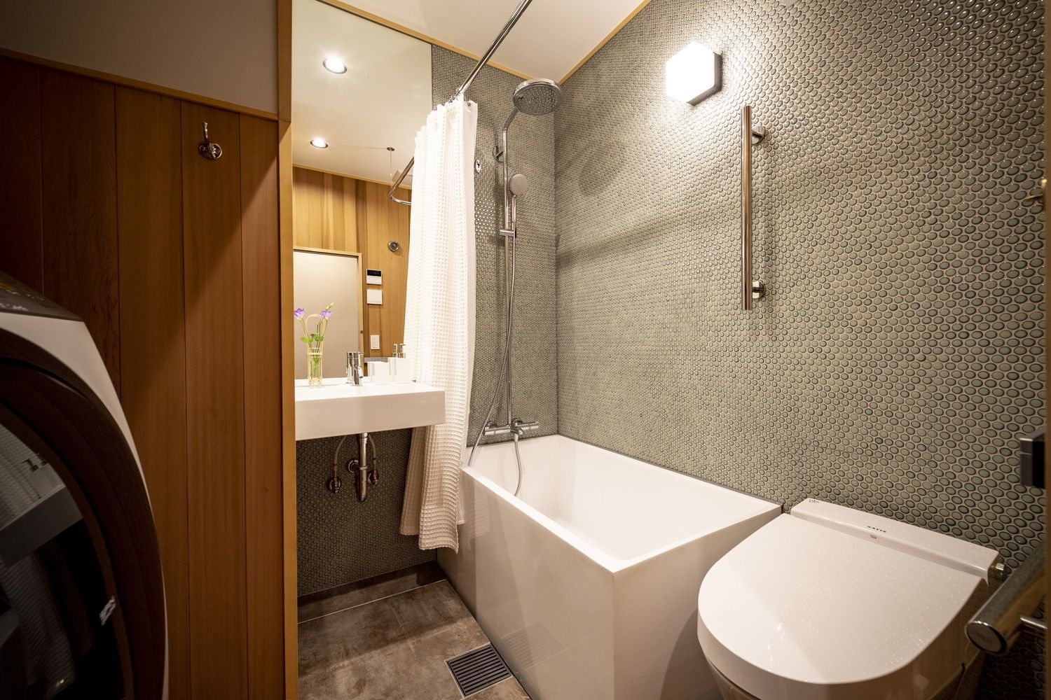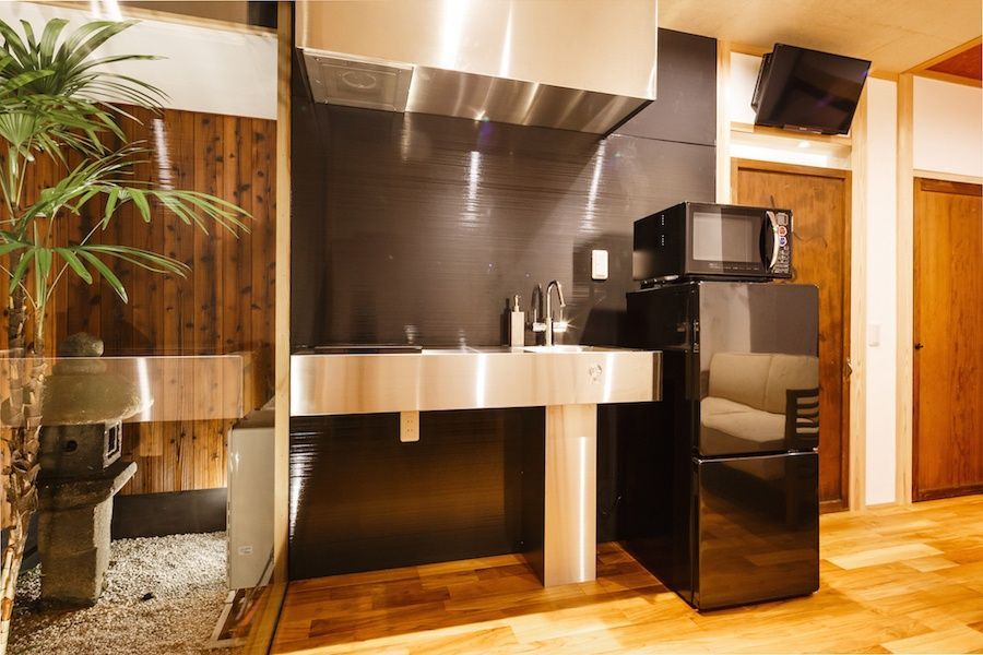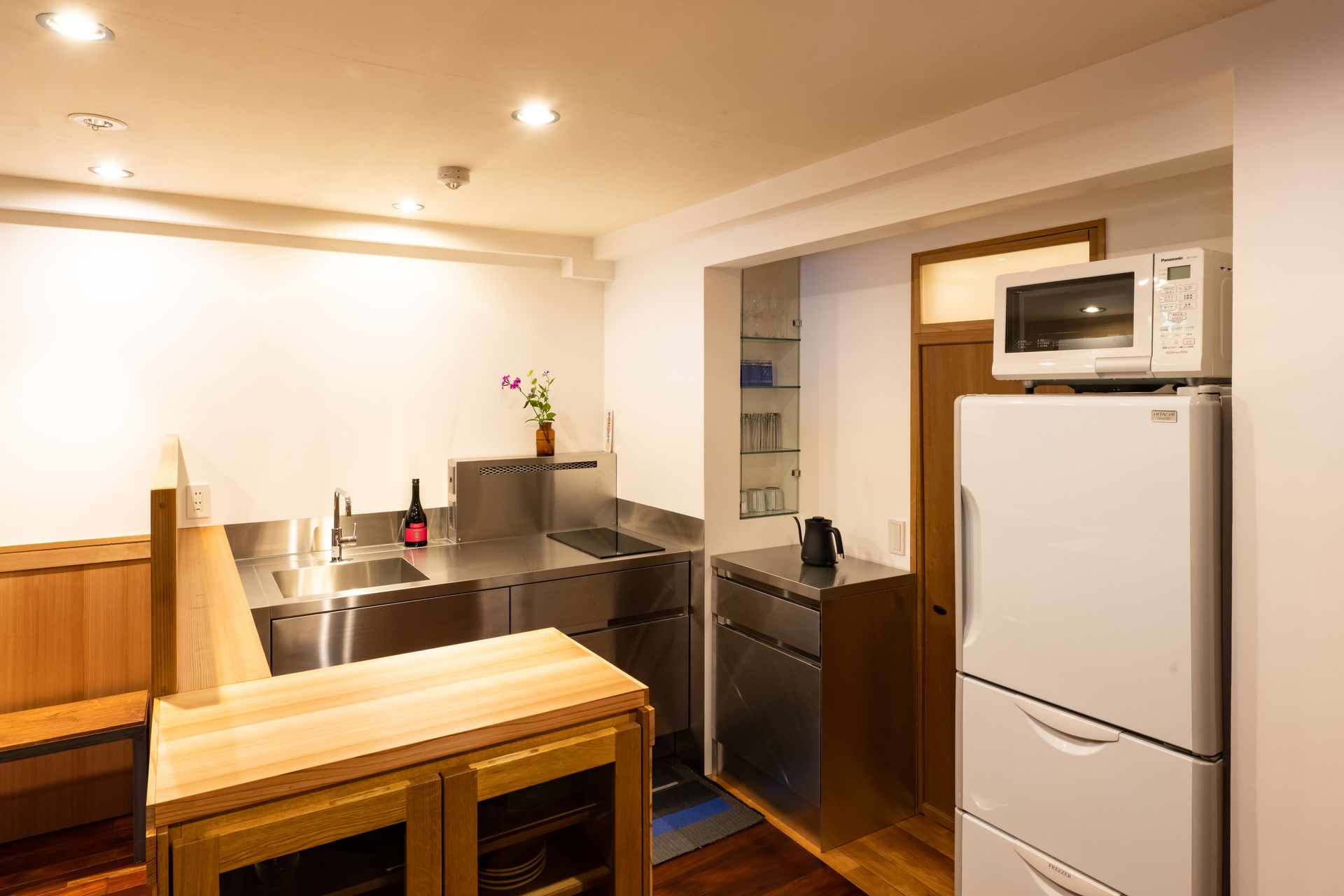 The ambiance is captivating yet cozy, exuding a modern Japanese aesthetic. Original Japanese architectural details are complimented by antique lighting fixtures and woodwork throughout, and by a thoughtful curation of antique Japanese and Scandinavian furniture, mixed with modern hand-crafted furniture by Japanese artisans. Beautiful handcrafted “washi” (Japanese paper) is used on ceilings and sliding doors. The exceptional design feature of this unit is the high-end, custom-built bath and shower area, which is made of stone. The oversized bath tub large enough for three persons. There is a private “tsuboniwa” inner garden, which can be viewed from the living room or the bath tub. The kitchen is fully stocked with everything one could need to prepare simple meals.