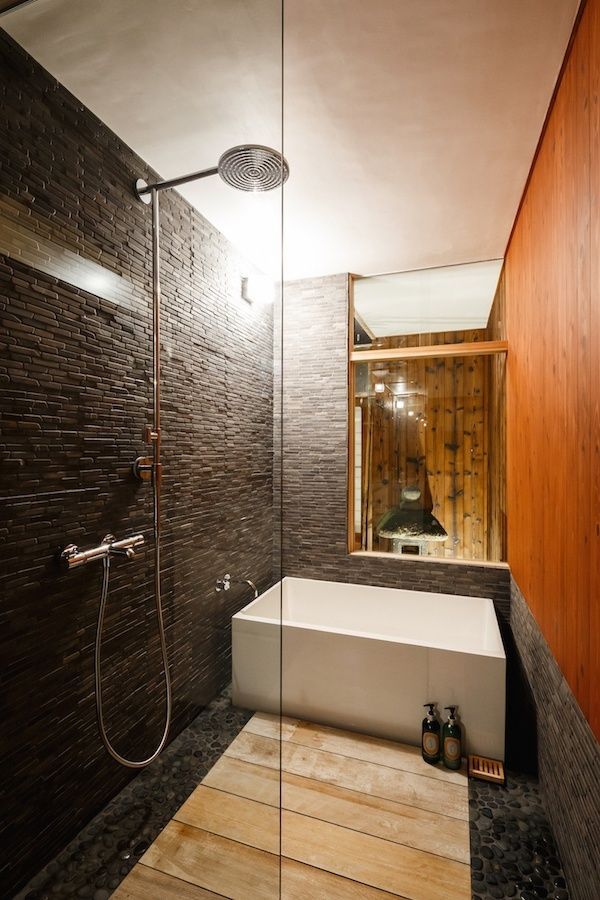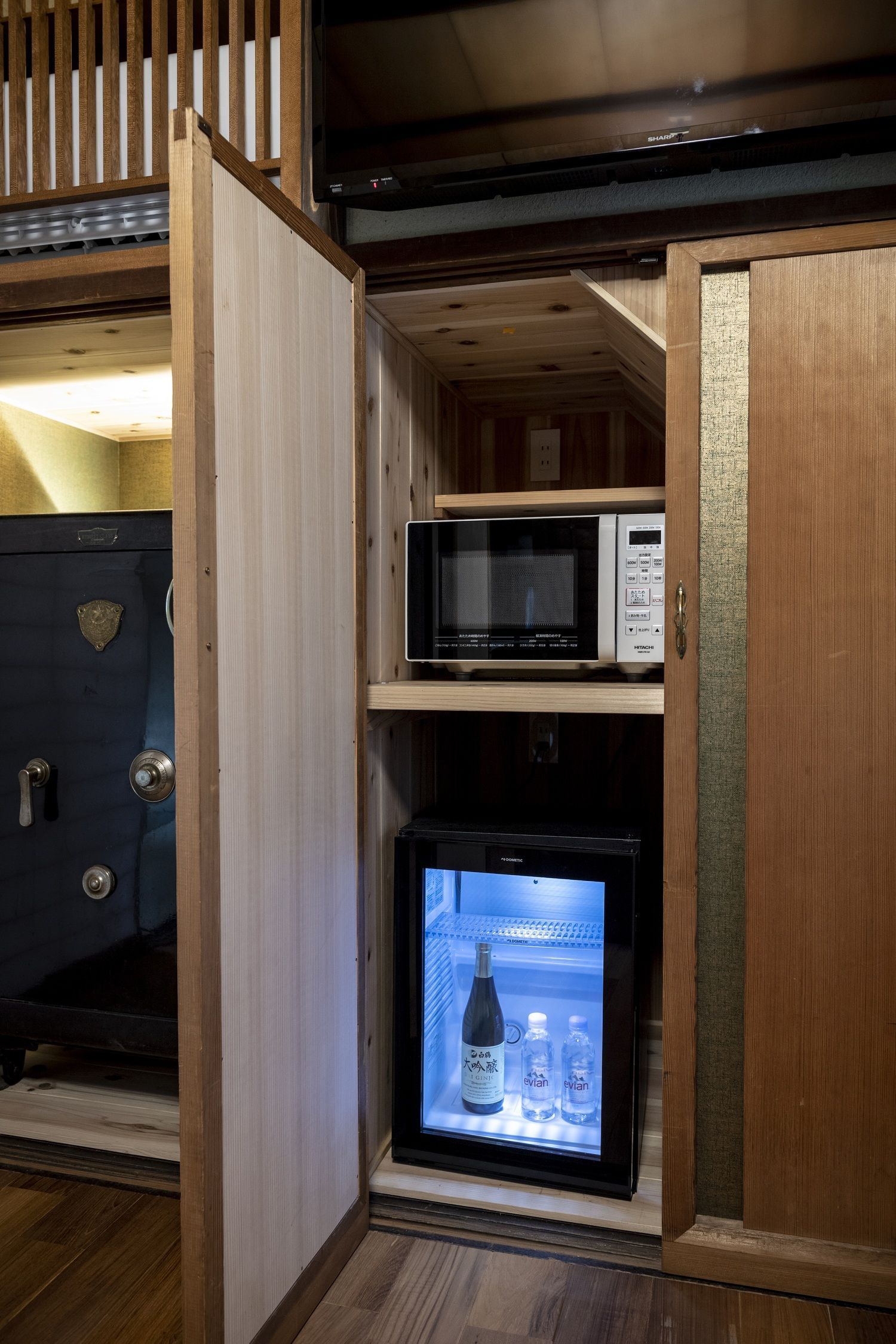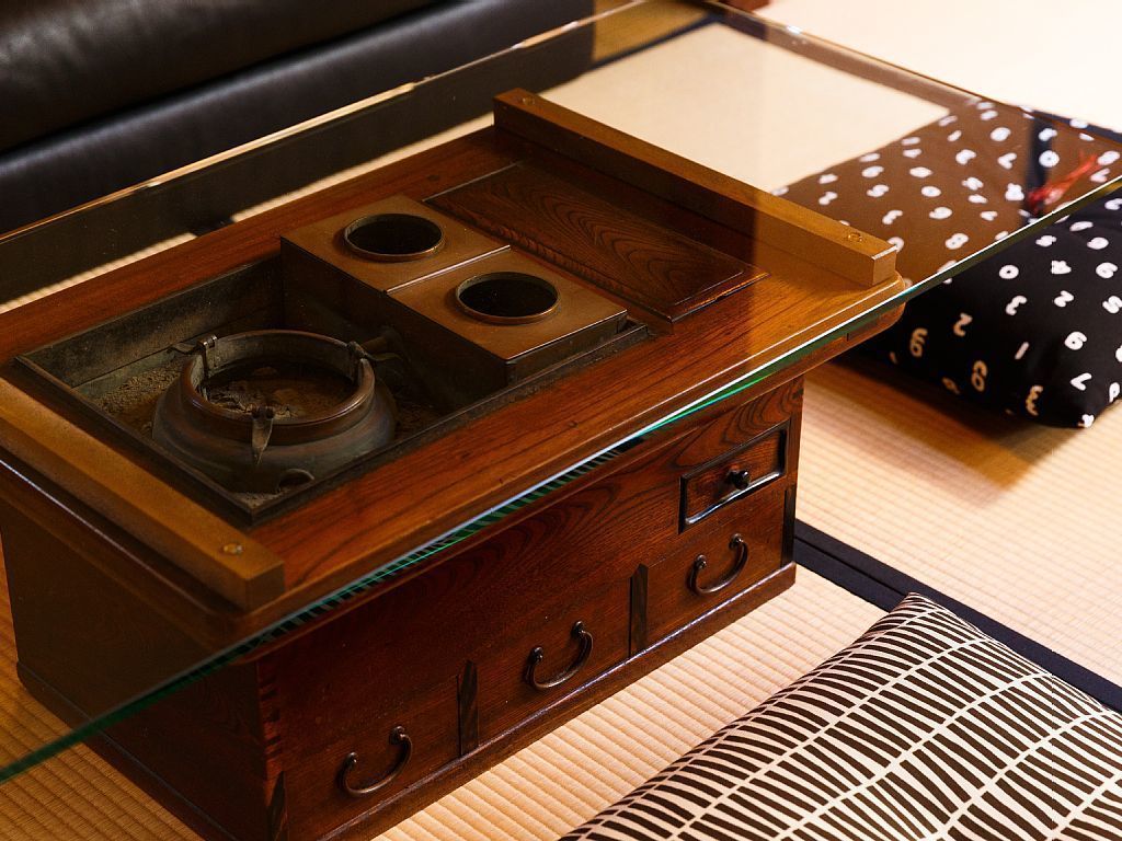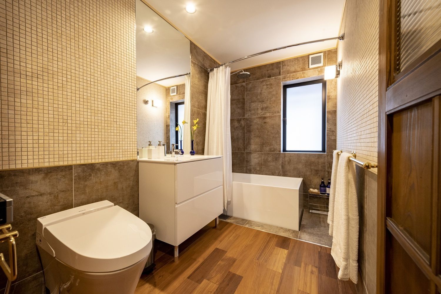 The ambiance is captivating yet cozy, exuding a modern Japanese aesthetic. Original Japanese architectural details are complimented by antique lighting fixtures and woodwork throughout, and by a thoughtful curation of antique Japanese and Scandinavian furniture, mixed with modern hand-crafted furniture by Japanese artisans. Beautiful handcrafted “washi” (Japanese paper) is used on ceilings and sliding doors. The exceptional design feature of this unit is the high-end, custom-built bath and shower area, which is made of stone. The oversized bath tub large enough for three persons. There is a private “tsuboniwa” inner garden, which can be viewed from the living room or the bath tub. The kitchen is fully stocked with everything one could need to prepare simple meals.