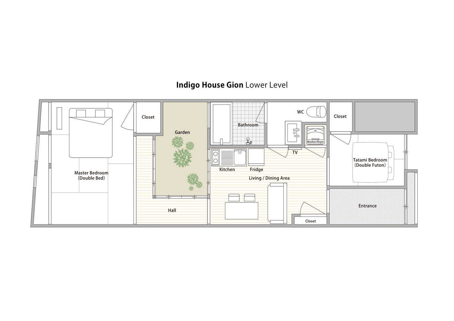 Indigo House Gion Lower Level is the full lower level of the house, with its own entrance. It’s completely independent from the Upper Level. There is enough room to accommodate two to three adults, or a couple with two children (please note: minimum age for children is 7.)