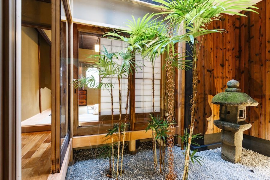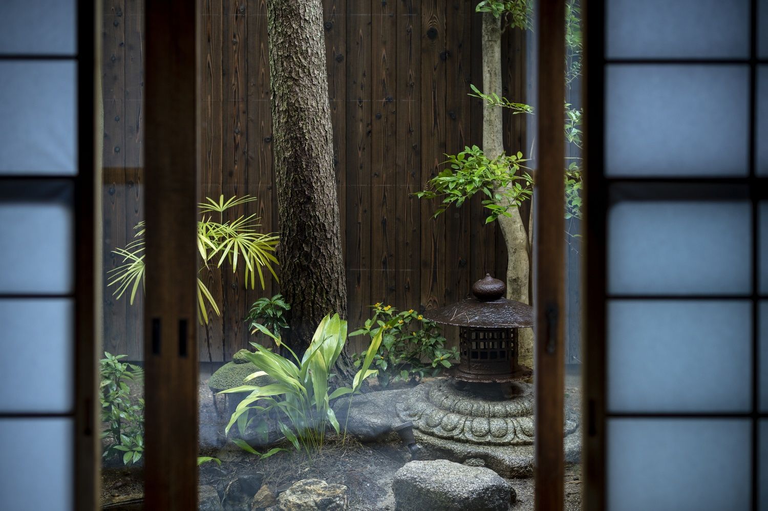 What is distinctive about Indigo House Gion? It’s bright and airy, since there are walls of glass surrounding the interior garden, which extends from the Lower Level to the Upper Level. The master bedroom has an expansive south-facing view of the inner area of Kenninji Temple, where you can see the monk’s cemetery and vegetable gardens, as well as the buildings where the monks live. There’s a lot of blue sky and green trees, and natural light. You can hear the sound of monks chanting their prayers early in the morning. You can also hear the enchanting sounds of crickets, cicadas, and nightingales, depending on the season.