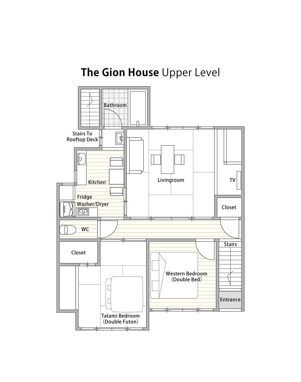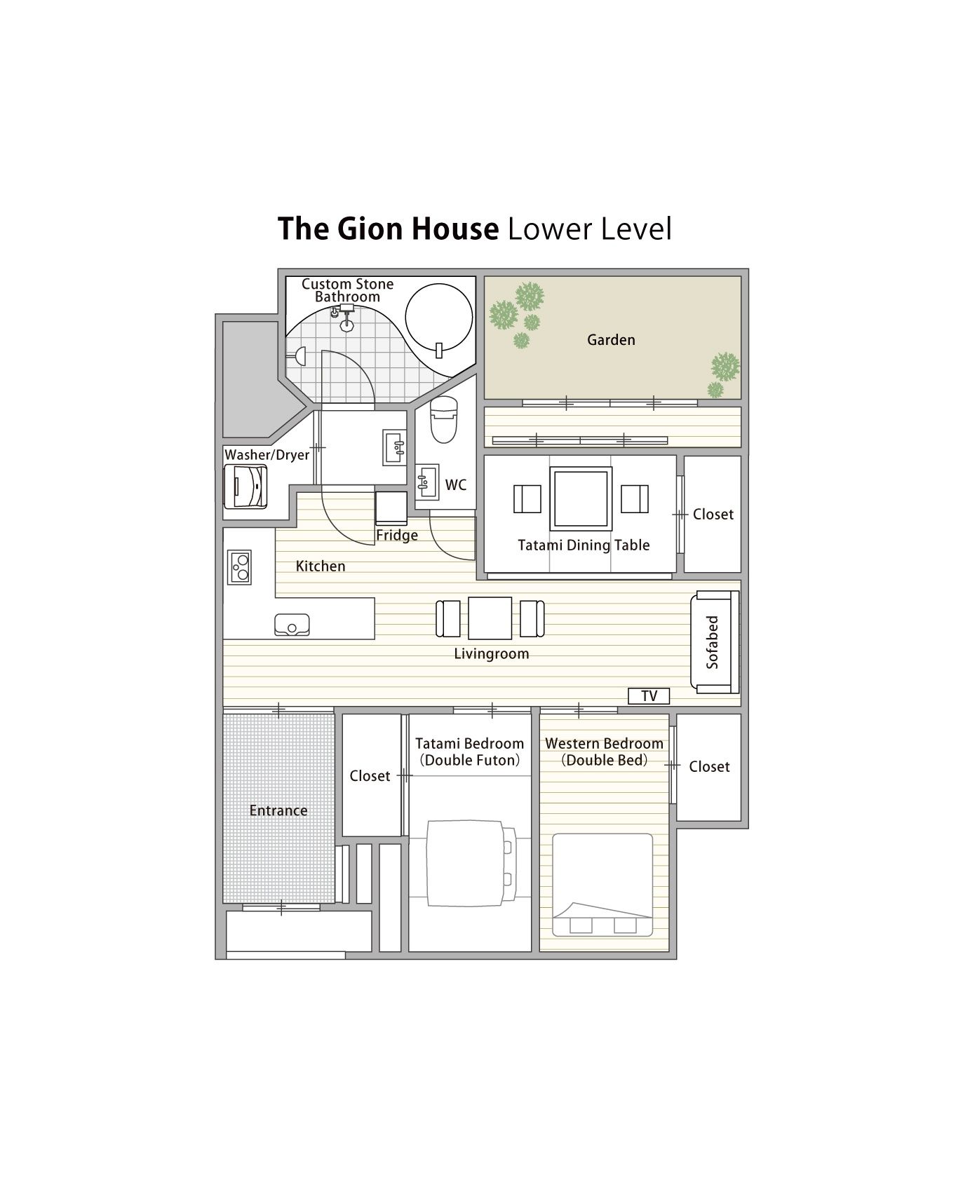 The Gion House – Entire House is available for groups of up to eight persons. Up to four persons can sleep comfortably on each level.