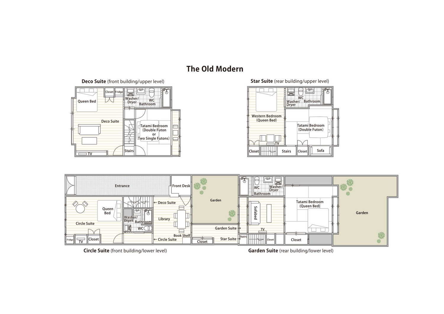 The Old Modern consists of two separate two-storey buildings, with two exquisite gardens. There are four luxurious full-floor suites, each with en-suite bath/toilet. All of our suites have these features: mini refrigerator, microwave oven, electric kettle, television, high-speed wifi internet, washer/dryer, iphone, and high-end pillows with goose-down comforters. Also provided in each suite is a Nespresso coffee/espresso maker with a selection of coffee capsules, as well as an assortment of teas.