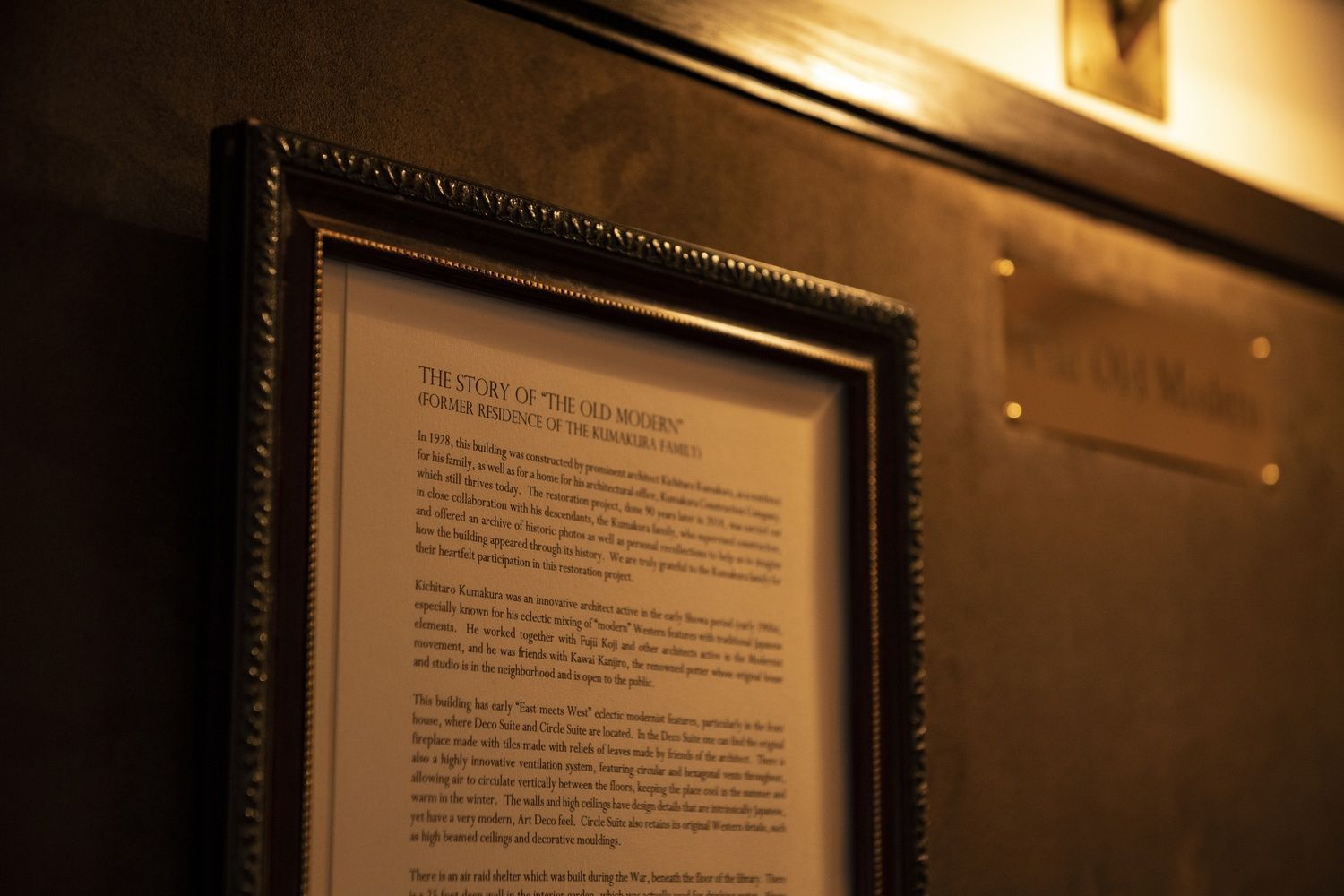 The Old Modern was built in 1928 by a prominent Kyoto architect as a residence for his family. It was meticulously maintained throughout the years, and the building underwent a complete high-end restoration in 2018. It is an architectural treasure, and a rare example of a "machiya" townhouse which is an eclectic blend of traditional Japanese structure with some very early "modern" Western details such as a fireplace, high beamed ceilings, and parquet flooring. The building has been designated by the City of Kyoto as an important cultural asset.