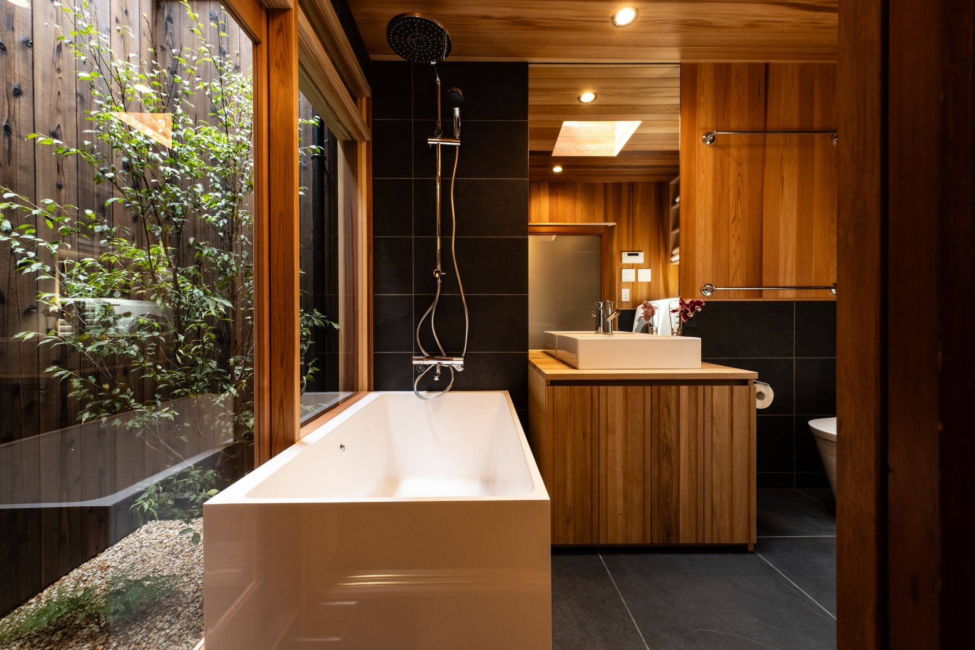 The Lower Level ambiance is captivating yet cozy, exuding a modern Japanese aesthetic. Original Japanese architectural details are complimented by antique lighting fixtures and woodwork throughout, and by a thoughtful curation of antique Japanese and Scandinavian furniture, mixed with modern hand-crafted furniture by Japanese artisans. Beautiful handcrafted “washi” (Japanese paper) is used on ceilings and sliding doors. The exceptional design feature of this unit is the high-end, custom-built bath and shower area, which is made of stone. The oversized bath tub large enough for three persons. There is a private “tsuboniwa” inner garden, which can be viewed from the living room or the bath tub. The kitchen is fully stocked with everything one could need to prepare simple meals.