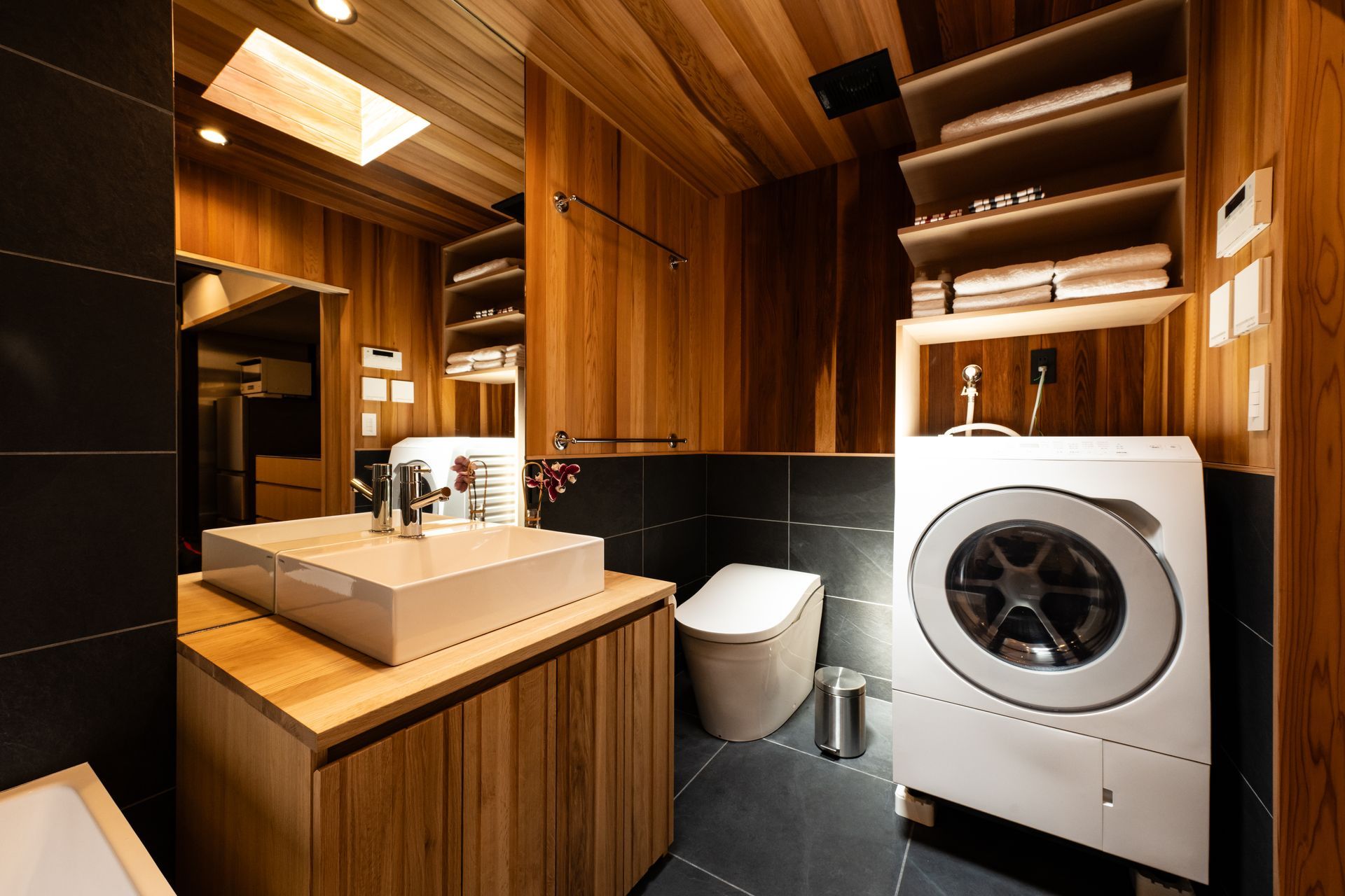 The bath area has the luxury of space. It features an extra wide shower head, with full-sized bath tub. Of course, the toilet has those high-tech functions. And of course, there is a washer/dryer for guest use.
