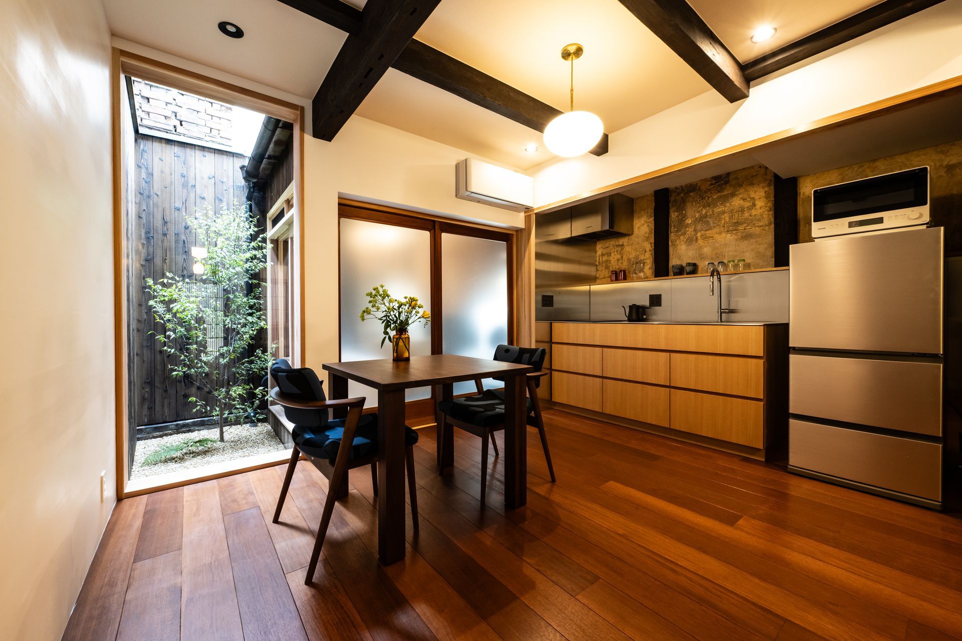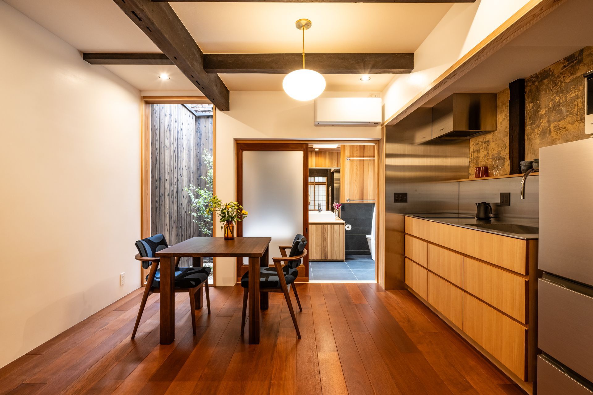 The ambiance is captivating yet cozy, exuding a modern Japanese aesthetic. Original Japanese architectural details are complimented by antique lighting fixtures and woodwork throughout, and by a thoughtful curation of antique Japanese and Scandinavian furniture, mixed with modern hand-crafted furniture by Japanese artisans. Beautiful handcrafted “washi” (Japanese paper) is used on ceilings and sliding doors. The exceptional design feature of this unit is the high-end, custom-built bath and shower area, which is made of stone. The oversized bath tub large enough for three persons. There is a private “tsuboniwa” inner garden, which can be viewed from the living room or the bath tub. The kitchen is fully stocked with everything one could need to prepare simple meals.