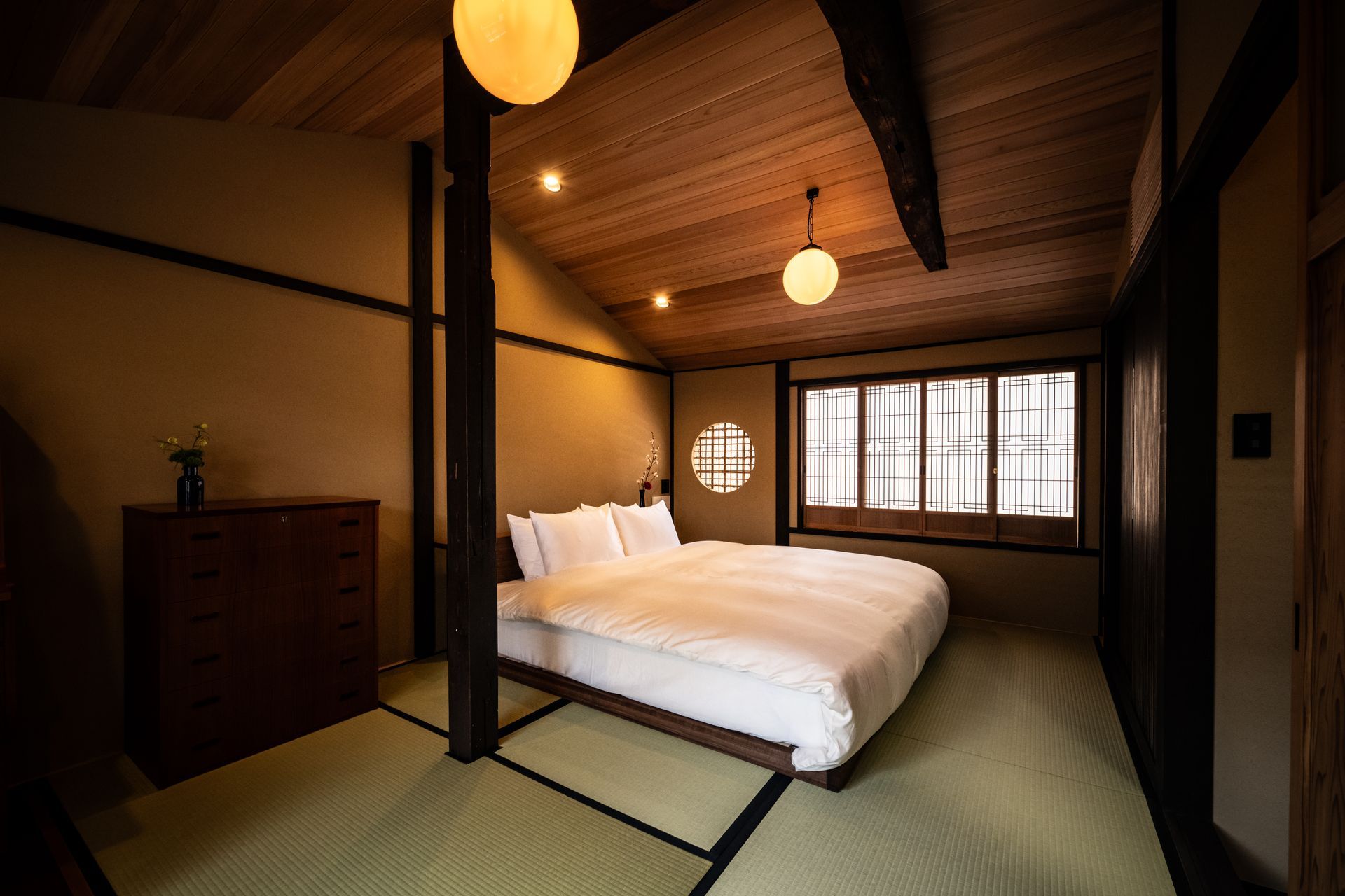 The Gion House Upper Level encompasses the entire upper floor of The Gion House, a traditional machiya which is steeped in history. Nestled on a quiet side street in the heart of Gion, the house was meticulously renovated in early 2023. With its own entrance, the Upper Level is completely independent from the Gion House Lower Level. There is room for up to four to sleep... two in the tatami bedroom on a futon, and two in the double bed in the Western-style bedroom. Alternatively, the entire house can be rented for up to eight persons.
